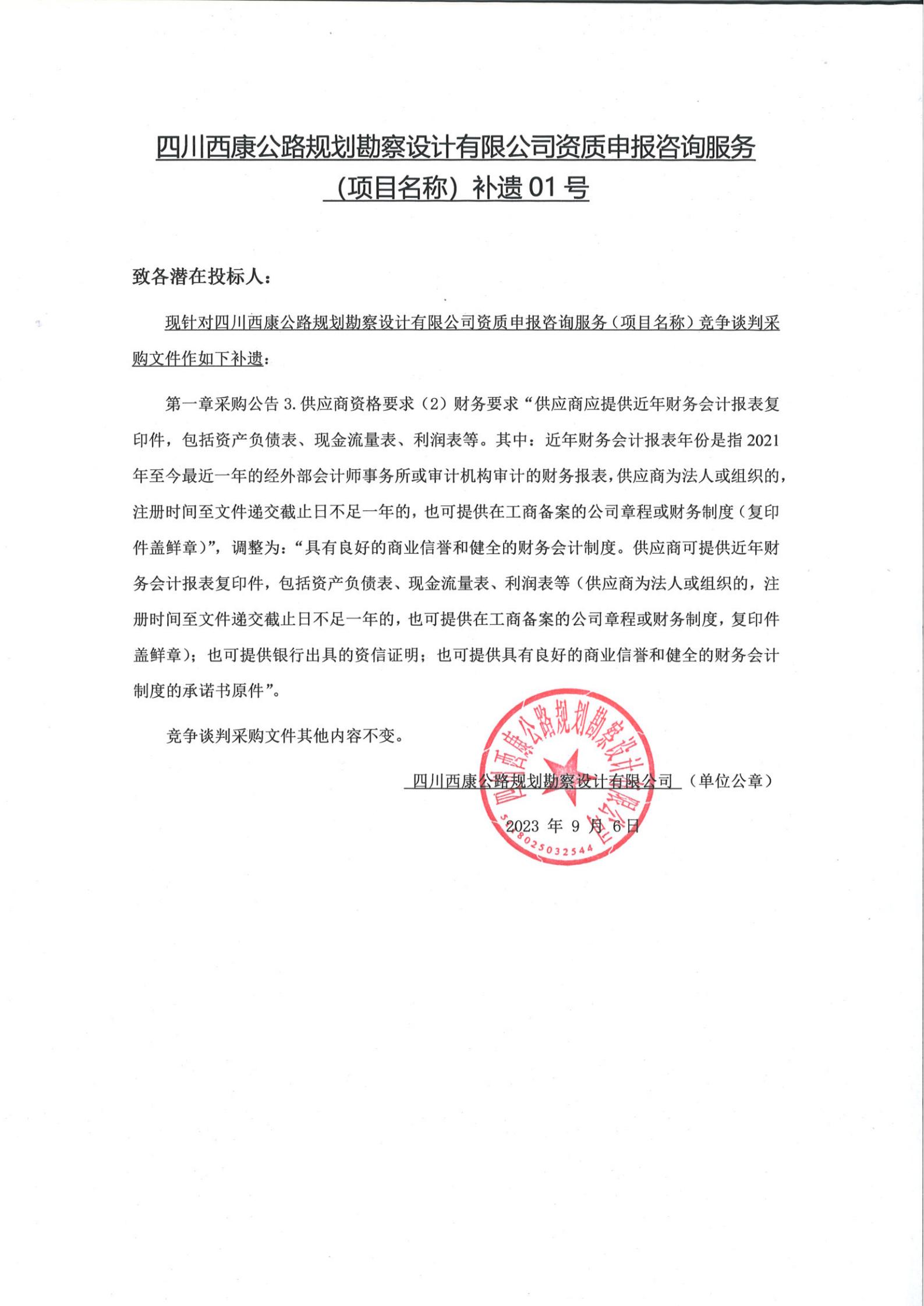 四川西康公路規(guī)劃勘察設(shè)計(jì)有限公司資質(zhì)申報(bào)咨詢(xún)服務(wù)(項(xiàng)目名稱(chēng))補(bǔ)遺01號(hào)