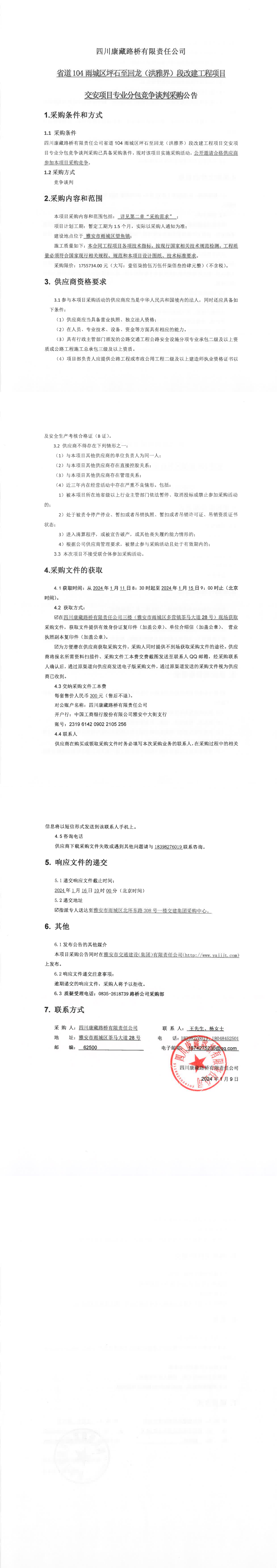 四川康藏路橋有限責(zé)任公司省道104雨城區(qū)坪石至回龍(洪雅界)段改建工程項(xiàng)目交安項(xiàng)目專業(yè)分包競(jìng)爭(zhēng)談判采購(gòu)公告
