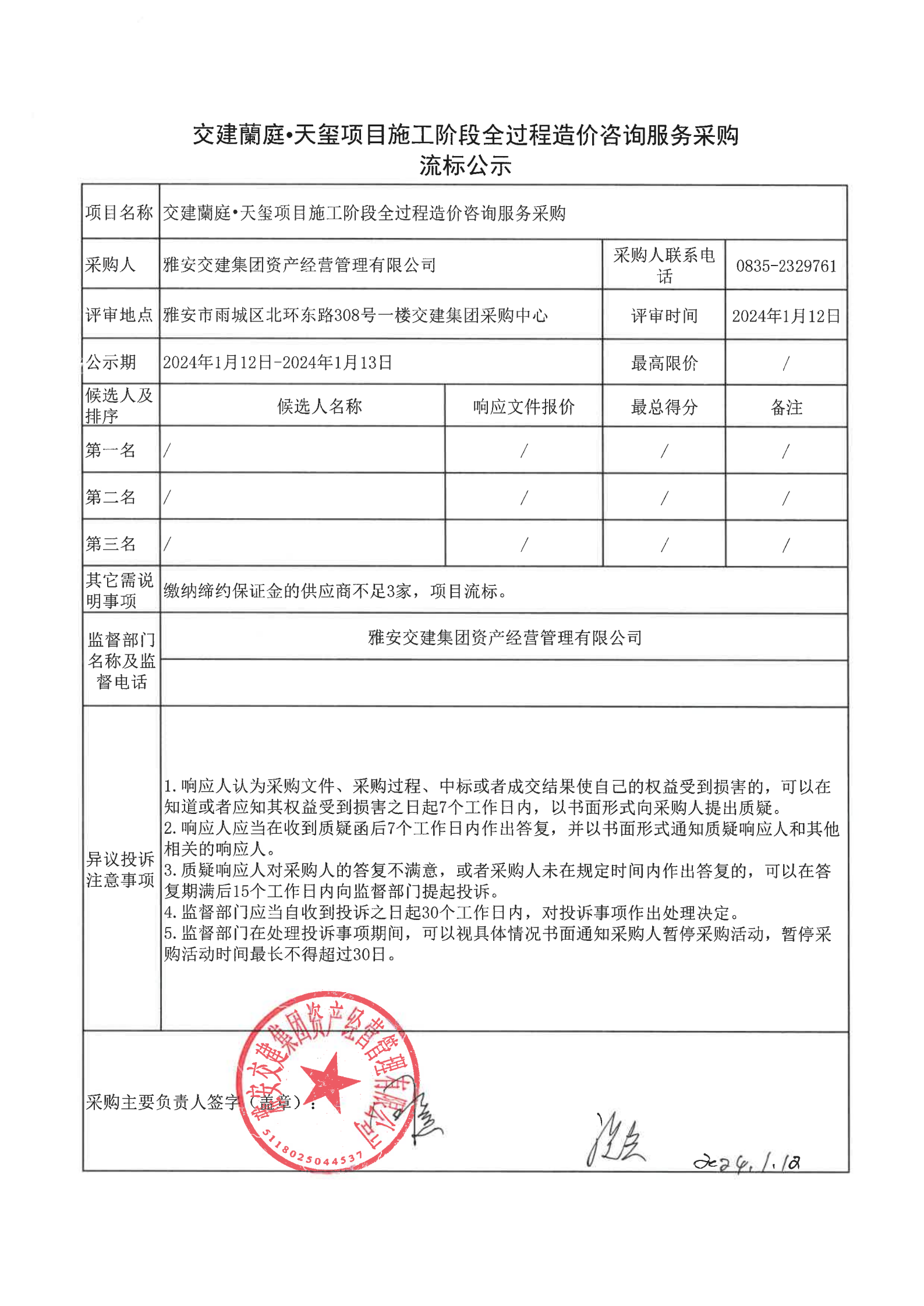 雅安交建集團(tuán)資產(chǎn)經(jīng)營(yíng)管理有限公司交建蘭庭·天璽項(xiàng)目施工階段全過(guò)程造價(jià)咨詢服務(wù)采購(gòu)流標(biāo)公示