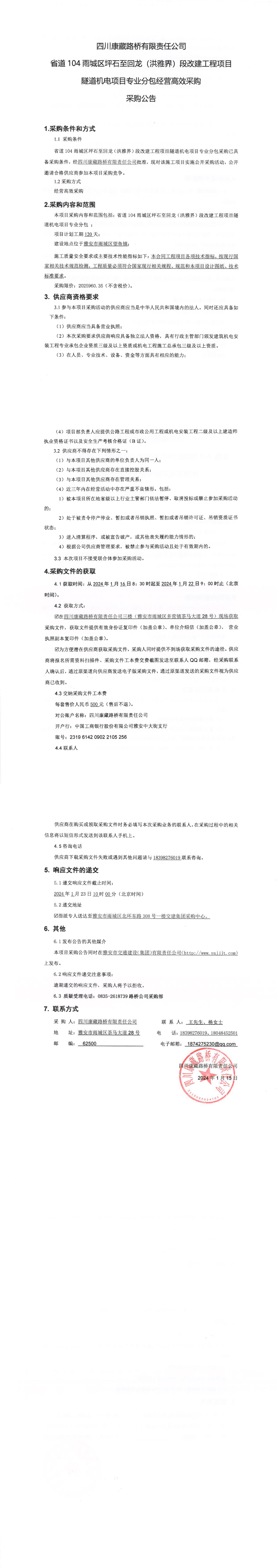 四川康藏路橋有限責任公司省道104雨城區(qū)坪石至回龍(洪雅界)段改建工程項目隧道機電項目專業(yè)分包經營高效采購公告