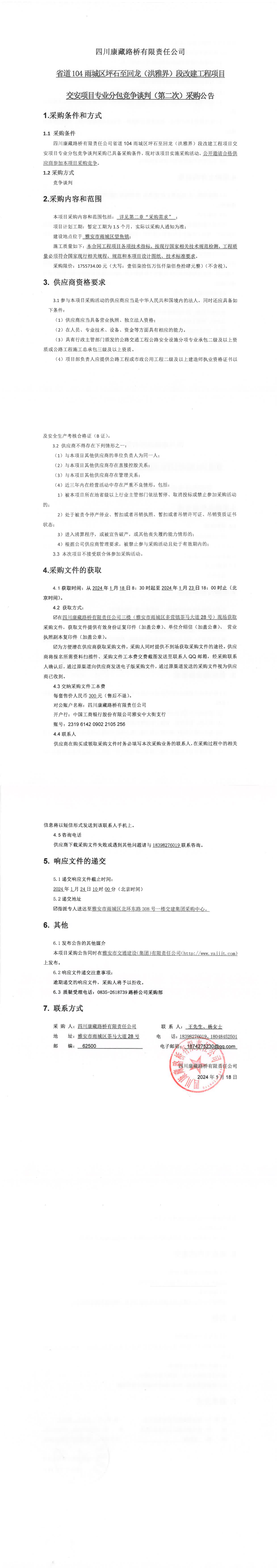 四川康藏路橋有限責(zé)任公司省道104雨城區(qū)坪石至回龍(洪雅界)段改建工程項(xiàng)目交安項(xiàng)目專業(yè)分包競爭談判(第二次)采購公告