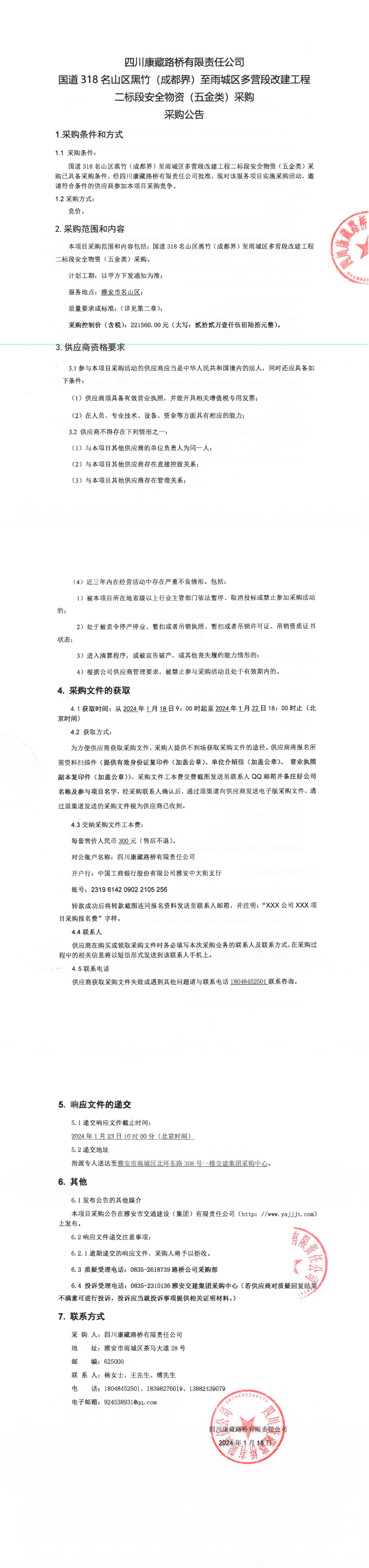 四川康藏路橋有限責(zé)任公司國(guó)道318名山區(qū)黑竹(成都界)至名山區(qū)多營(yíng)段改建工程二標(biāo)段安全物資(五金類)采購(gòu)公告