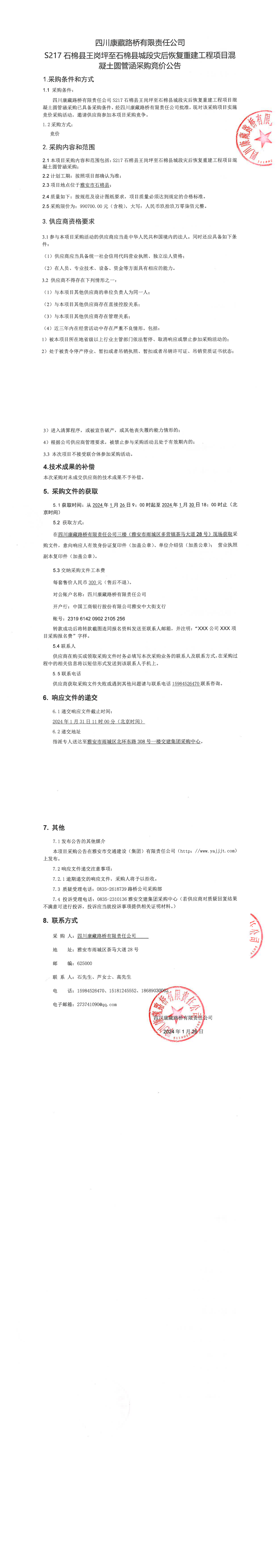 四川康藏路橋有限責(zé)任公司S217石棉縣王崗坪至石棉縣城段災(zāi)后恢復(fù)重建工程項(xiàng)目混凝土圓管涵采購競價公告