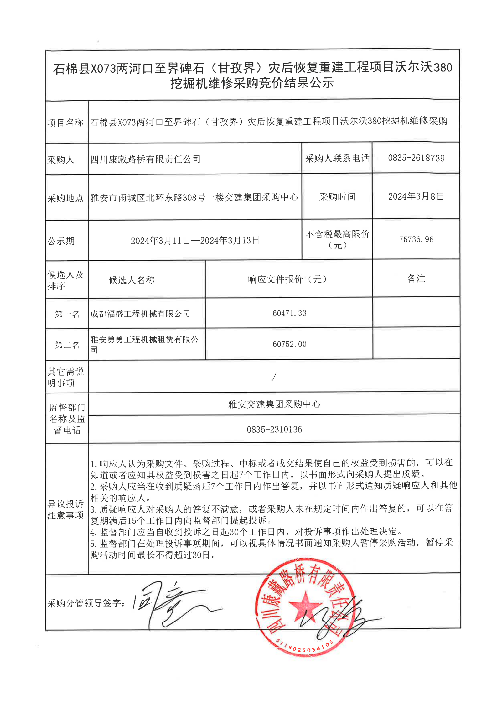 四川康藏路橋有限責(zé)任公司石棉縣X073兩河口至界碑石(甘孜界)災(zāi)后恢復(fù)重建工程項(xiàng)目沃爾沃380挖掘機(jī)維修采購競價(jià)結(jié)果公示