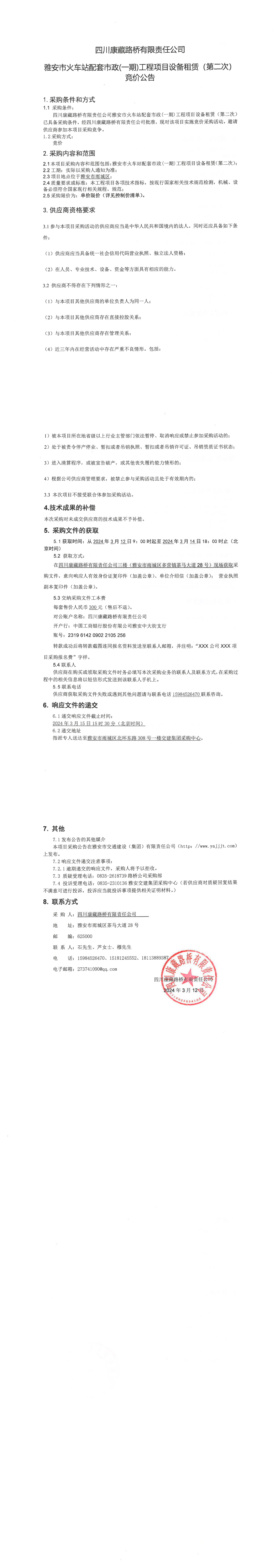 四川康藏路橋有限責任公司雅安市火車站配套市政(一期)工程項目設備租賃(第二次)競價公告