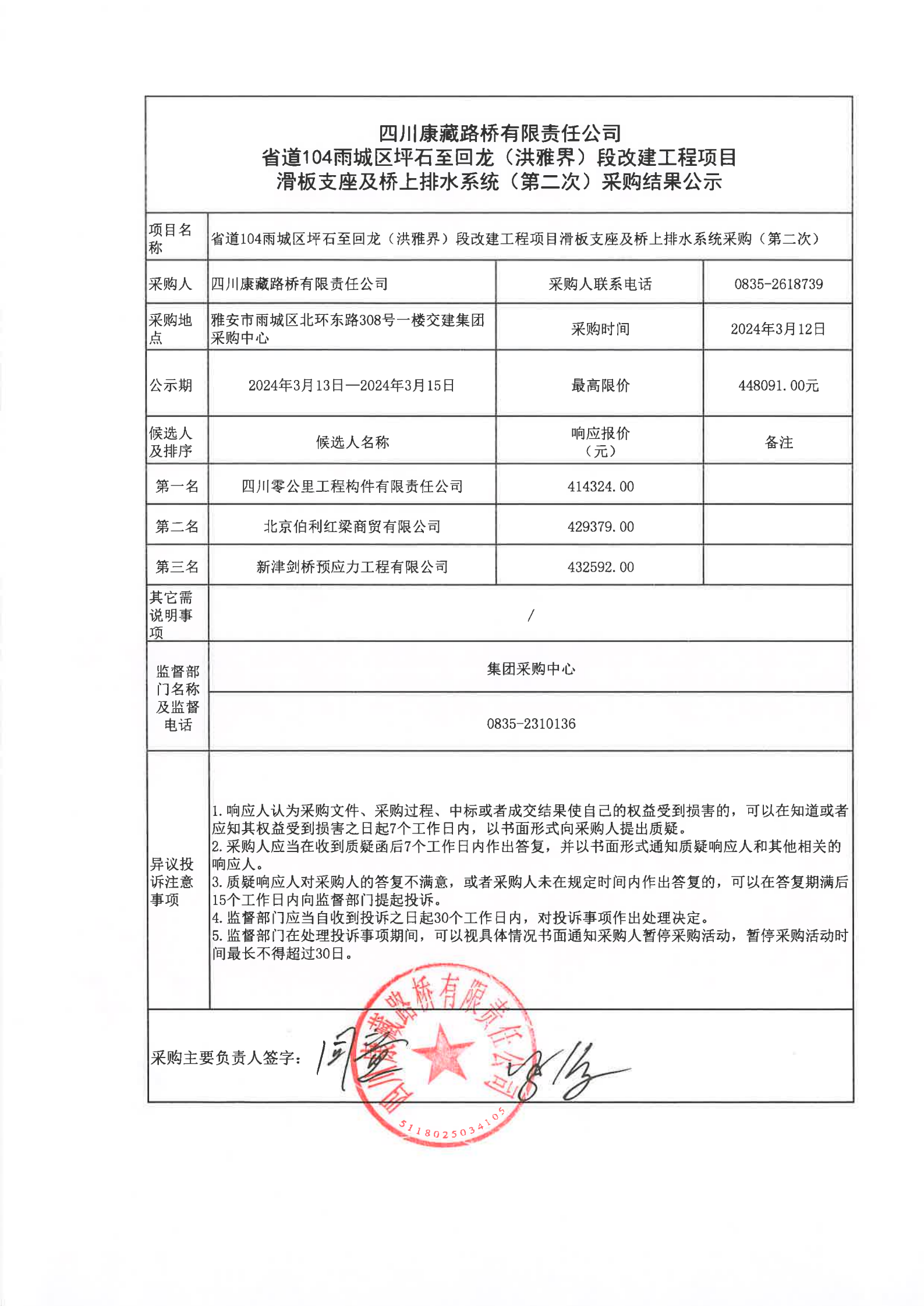 四川康藏路橋有限責任公司省道104雨城區(qū)坪石至回龍(洪雅界)段改建工程項目滑板支座及橋上排水系統(tǒng)(第二次)采購結(jié)果公示