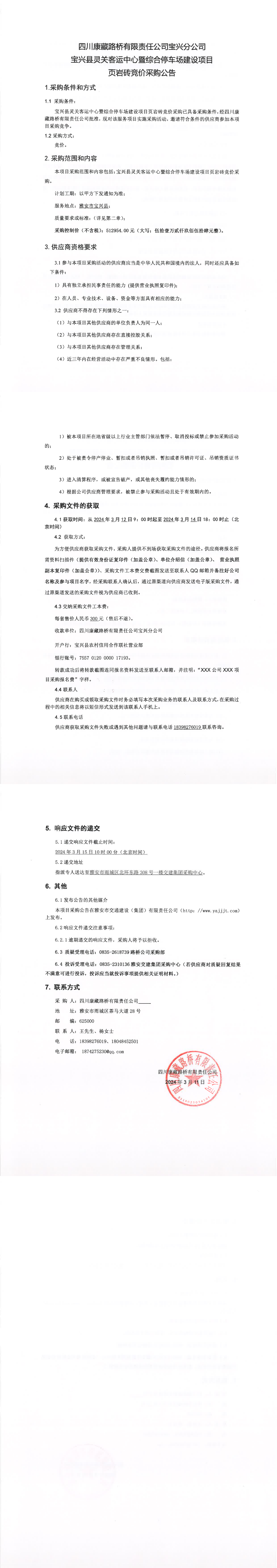 四川康藏路橋有限責(zé)任公司寶興縣靈關(guān)客運(yùn)中心暨綜合停車場(chǎng)建設(shè)項(xiàng)目頁(yè)巖磚競(jìng)價(jià)采購(gòu)公告