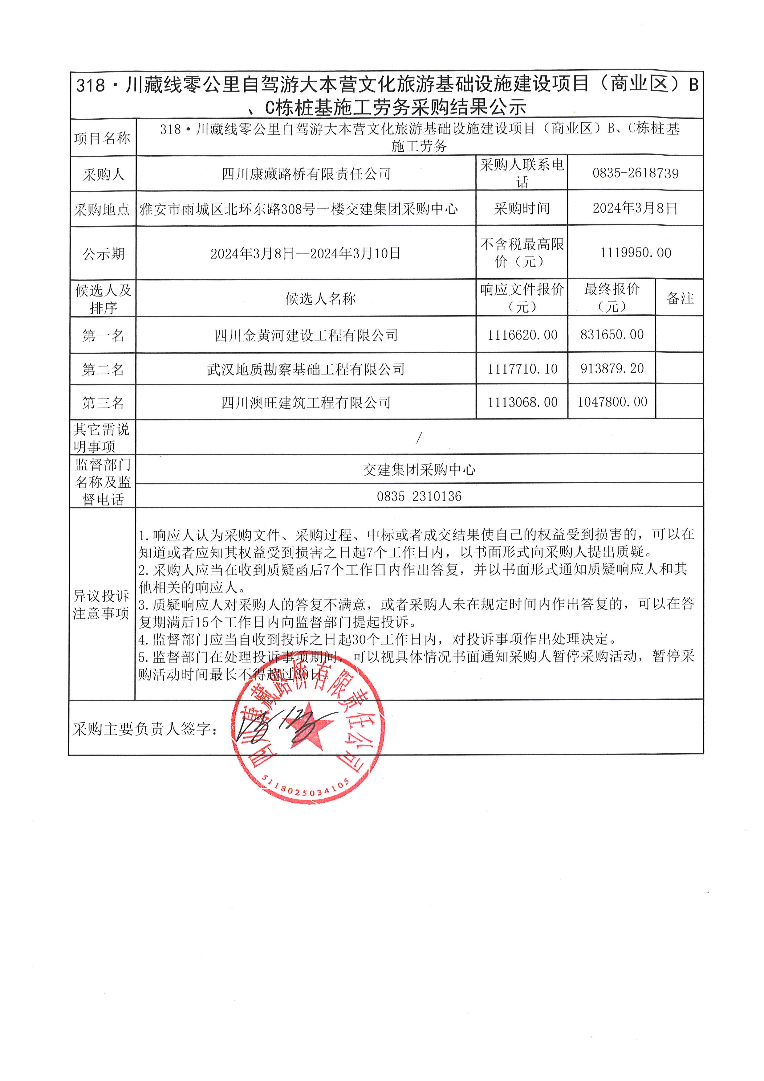 四川康藏路橋有限責任公司318·川藏線零公里自駕游大本營文化旅游基礎(chǔ)設施建設項目(商業(yè)區(qū))B、C棟樁基施工勞務結(jié)果公示