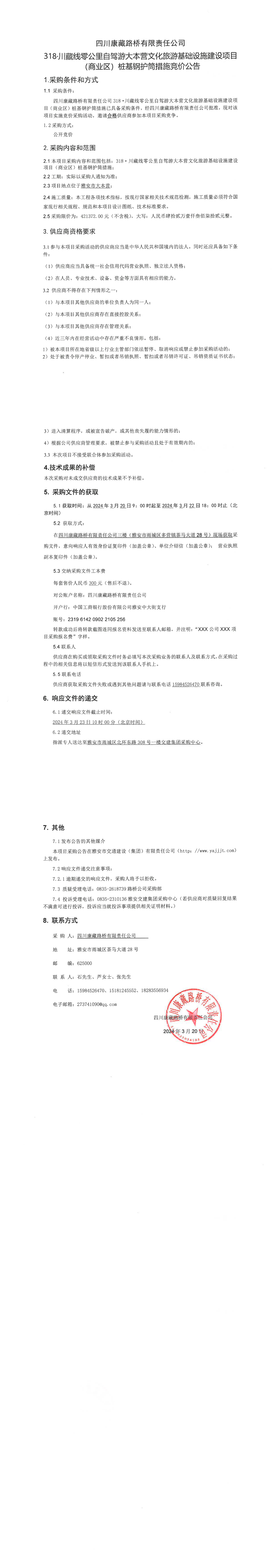 四川康藏路橋有限責(zé)任公司318·川藏公路零公里自駕游大本營(yíng)文化旅游基礎(chǔ)設(shè)施建設(shè)項(xiàng)目(商業(yè)區(qū))樁基鋼護(hù)筒措施競(jìng)價(jià)公告