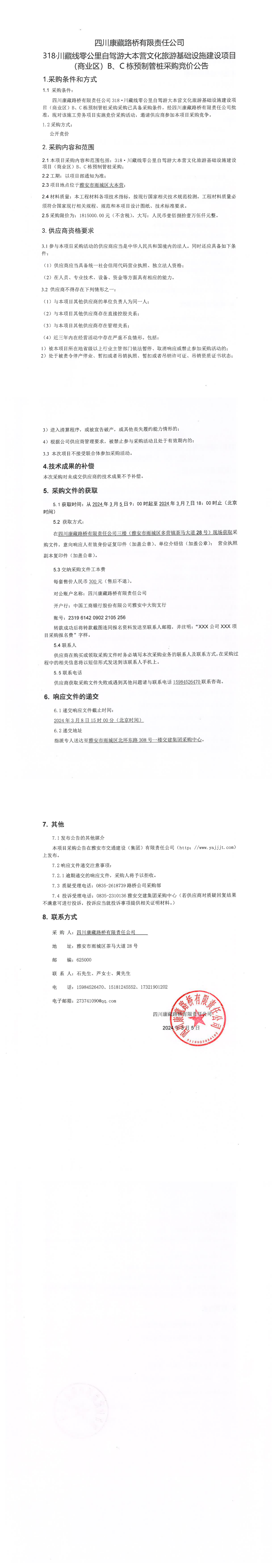 四川康藏路橋有限責(zé)任公司318·川藏公路零公里自駕游大本營文化旅游基礎(chǔ)設(shè)施建設(shè)項目(商業(yè)區(qū))B\C棟預(yù)制管樁采購競價公告
