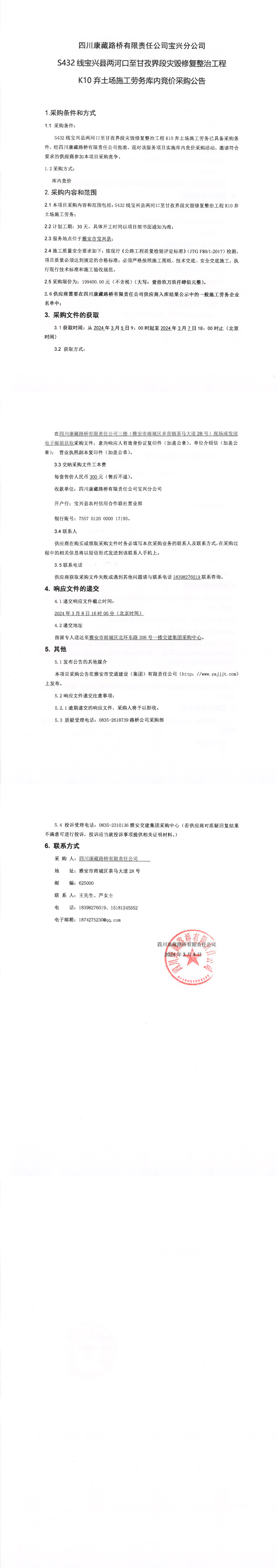 四川康藏路橋有限責(zé)任公司S432線寶興縣兩河口至甘孜界段災(zāi)毀修復(fù)整治工程K10棄土場(chǎng)施工勞務(wù)庫內(nèi)競(jìng)價(jià)采購公告