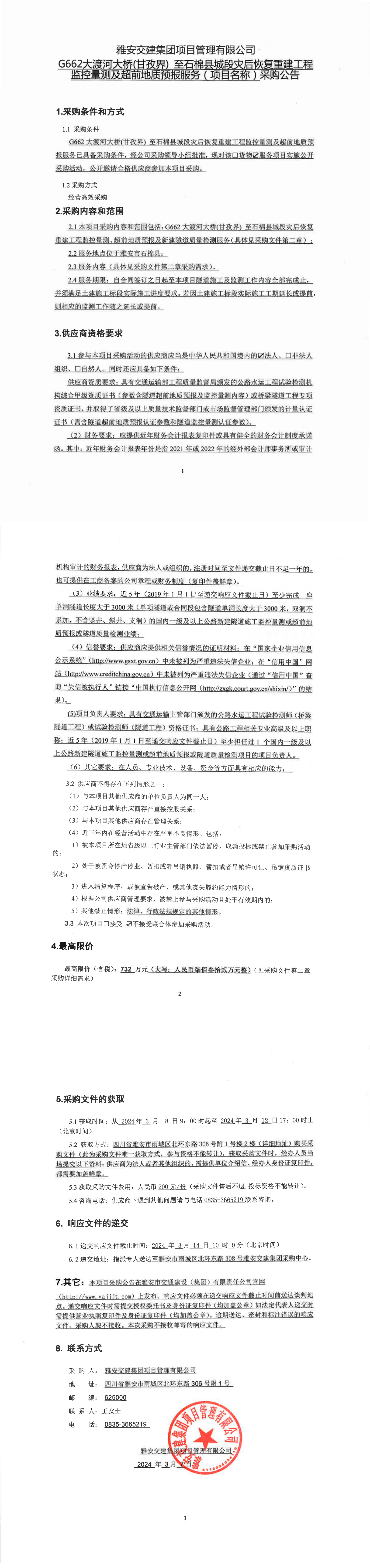 雅安交建集團(tuán)項(xiàng)目管理有限公司G662大渡河大橋(甘孜界)至石棉縣城段災(zāi)后恢復(fù)重建工程監(jiān)控量測及超前地質(zhì)預(yù)報(bào)服務(wù)(項(xiàng)目名稱)采購公告
