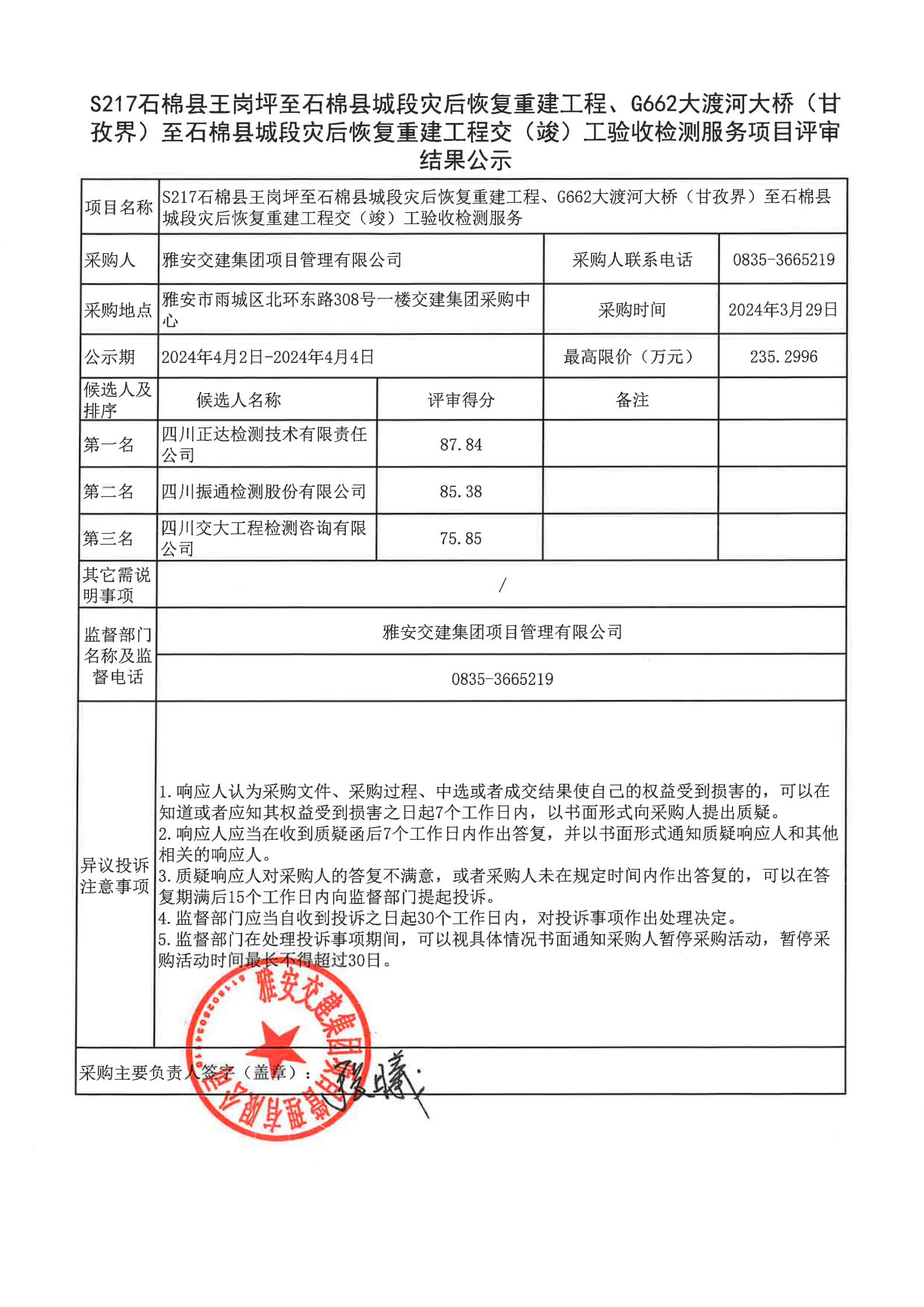 雅安交建集團(tuán)項(xiàng)目管理有限公司S217石棉縣王崗坪至石棉縣城段災(zāi)后恢復(fù)重建工程、G662大渡河大橋(甘孜界)至石棉縣城段災(zāi)后恢復(fù)重建工程交(竣)工驗(yàn)收檢測服務(wù)項(xiàng)目評(píng)審結(jié)果公示
