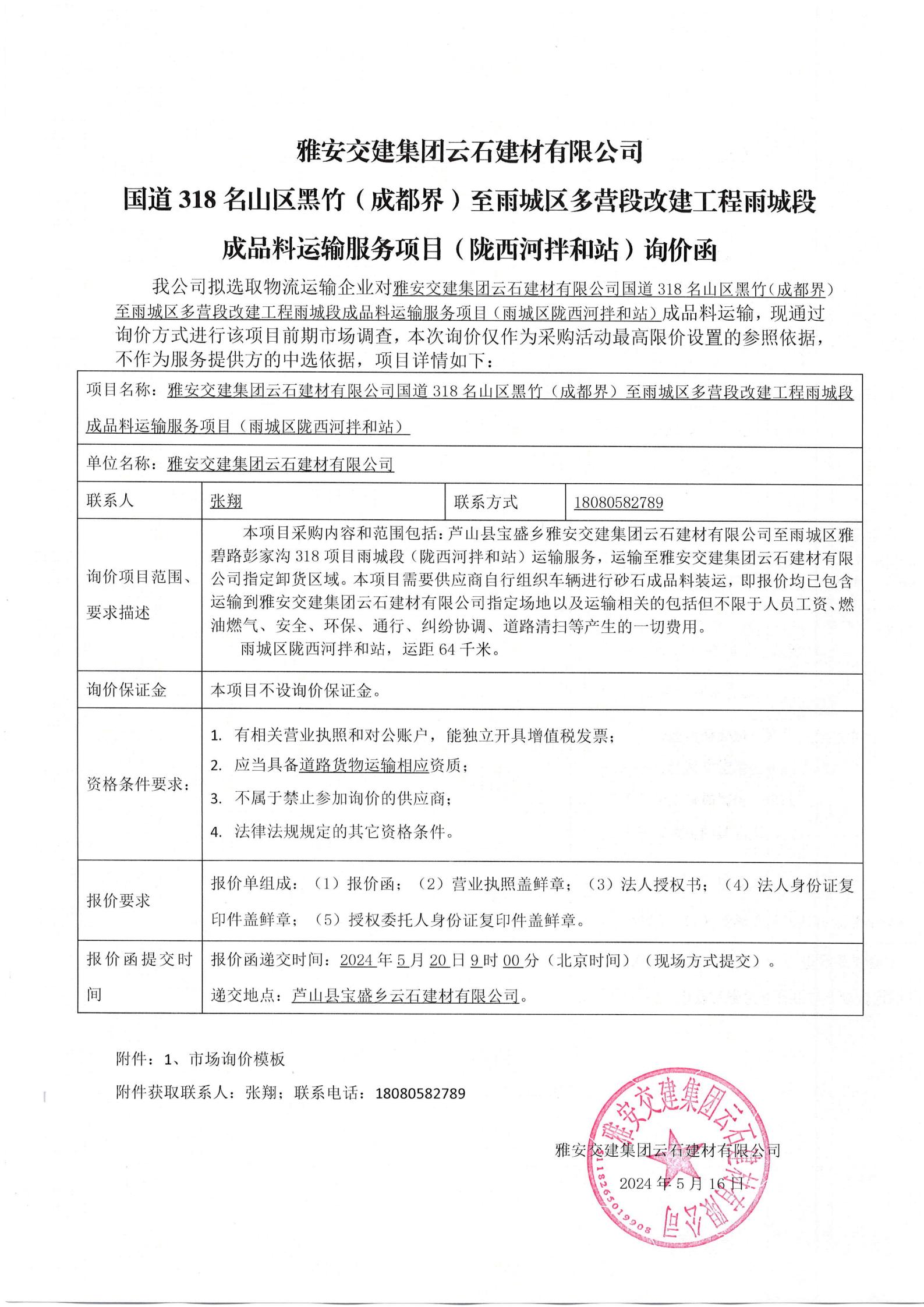 雅安交建集團(tuán)云石建材有限公司國(guó)道318名山區(qū)黑竹(成都界)至雨城區(qū)多營(yíng)段改建工程雨城段成品料運(yùn)輸服務(wù)項(xiàng)目(雨城區(qū)隴西河拌和站)詢(xún)價(jià)函