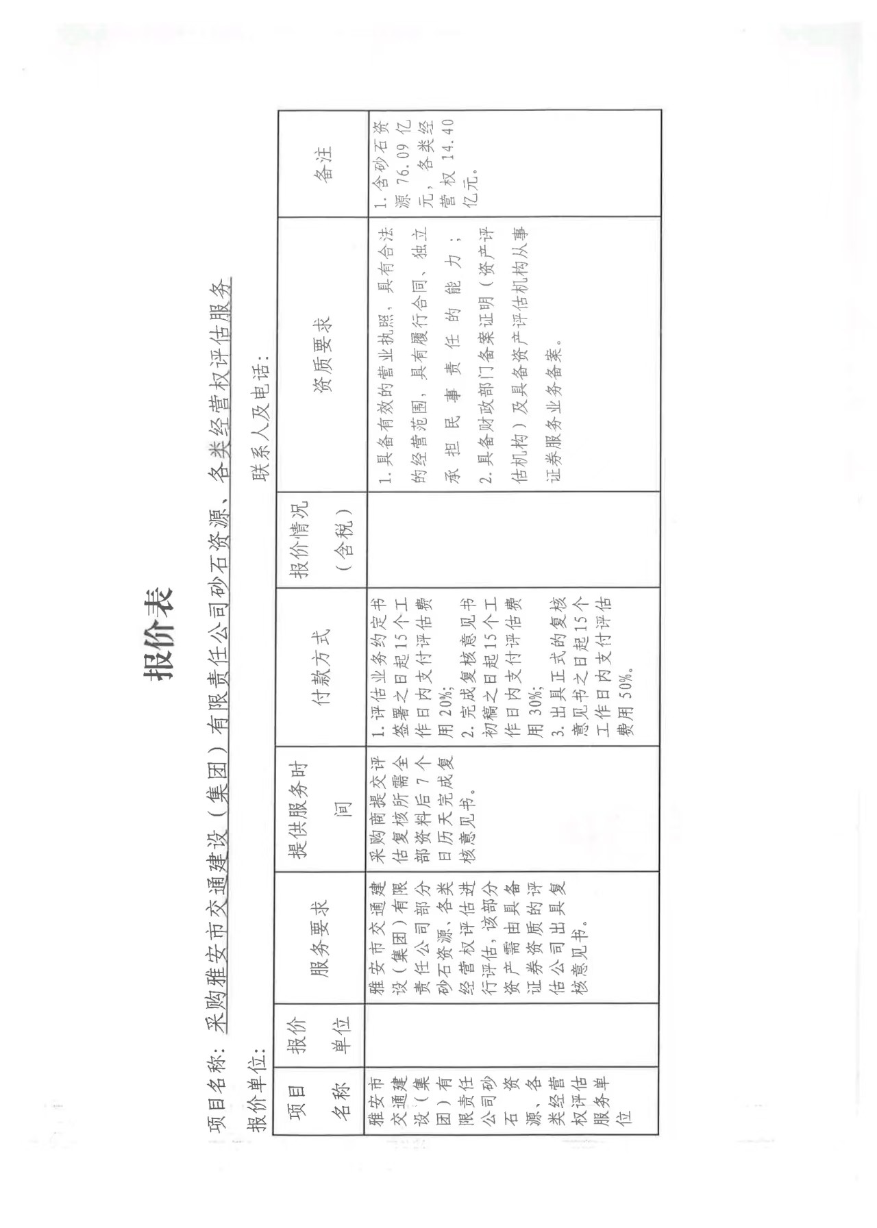 關(guān)于雅安市交通建設(shè)(集團(tuán))有限責(zé)任公司砂石資源、各類(lèi)經(jīng)營(yíng)權(quán)評(píng)估服務(wù)限價(jià)的詢(xún)價(jià)函