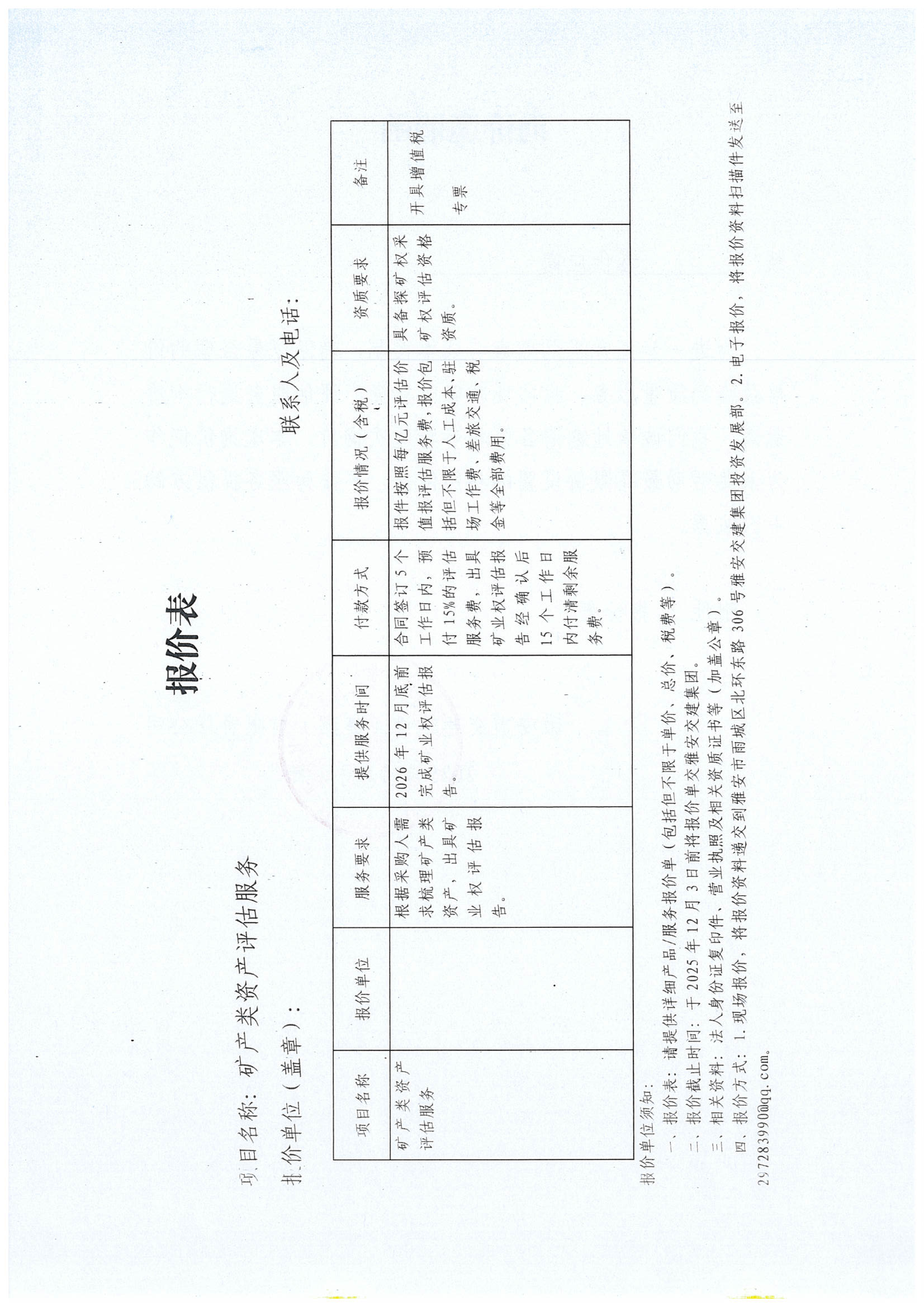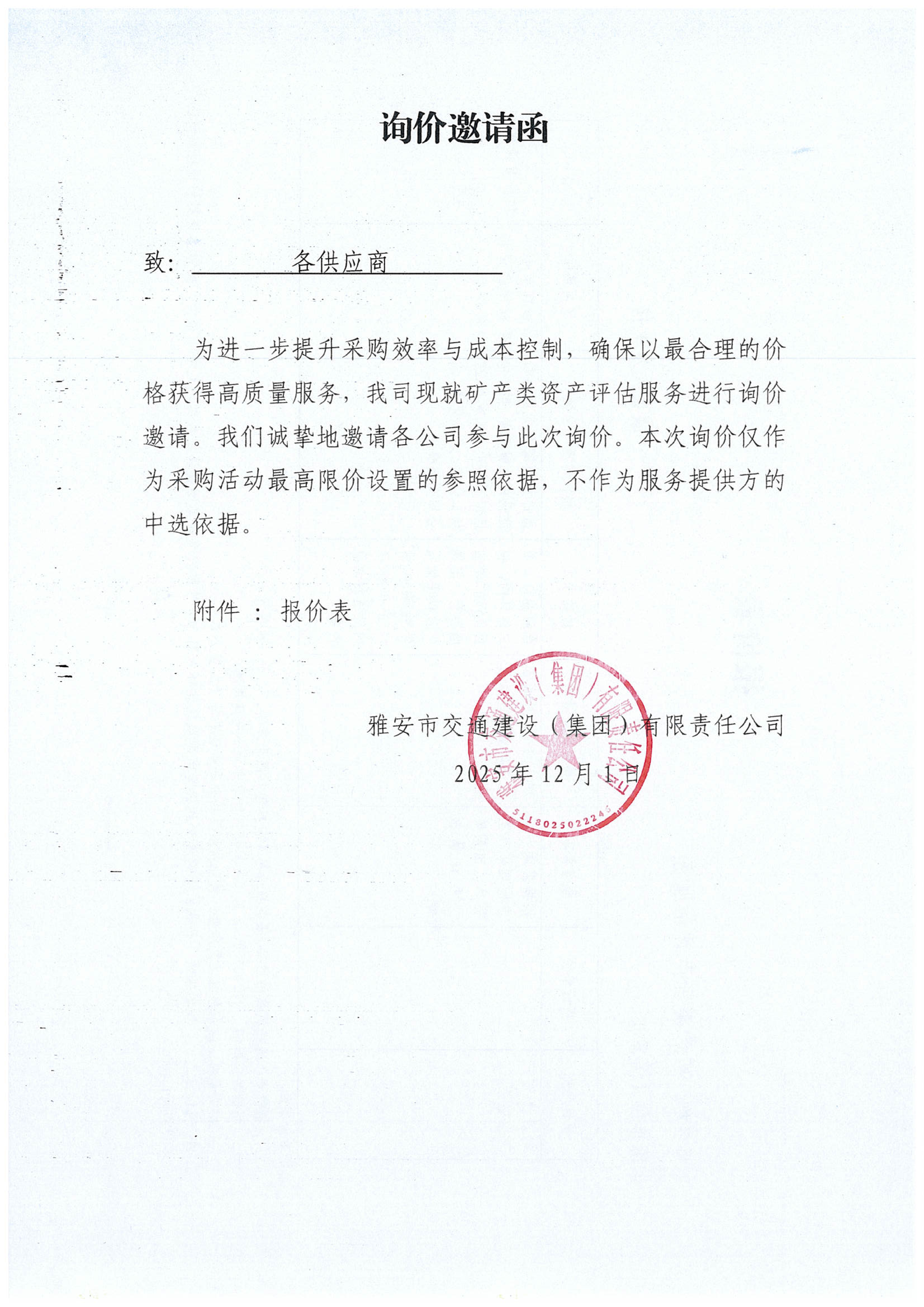 關于雅安市交通建設(集團)有限責任公司礦產類資產評估服務采購限價的詢價函