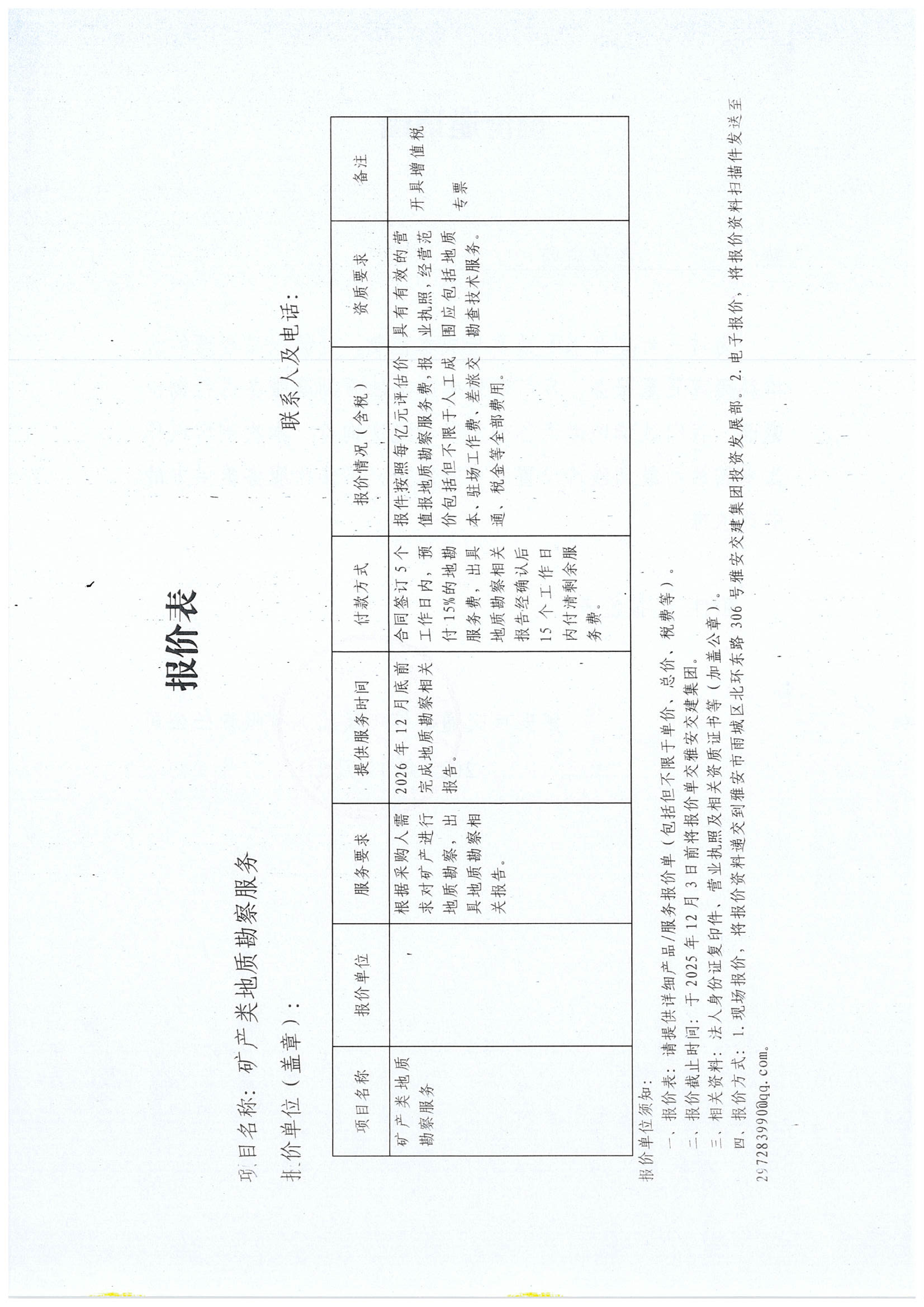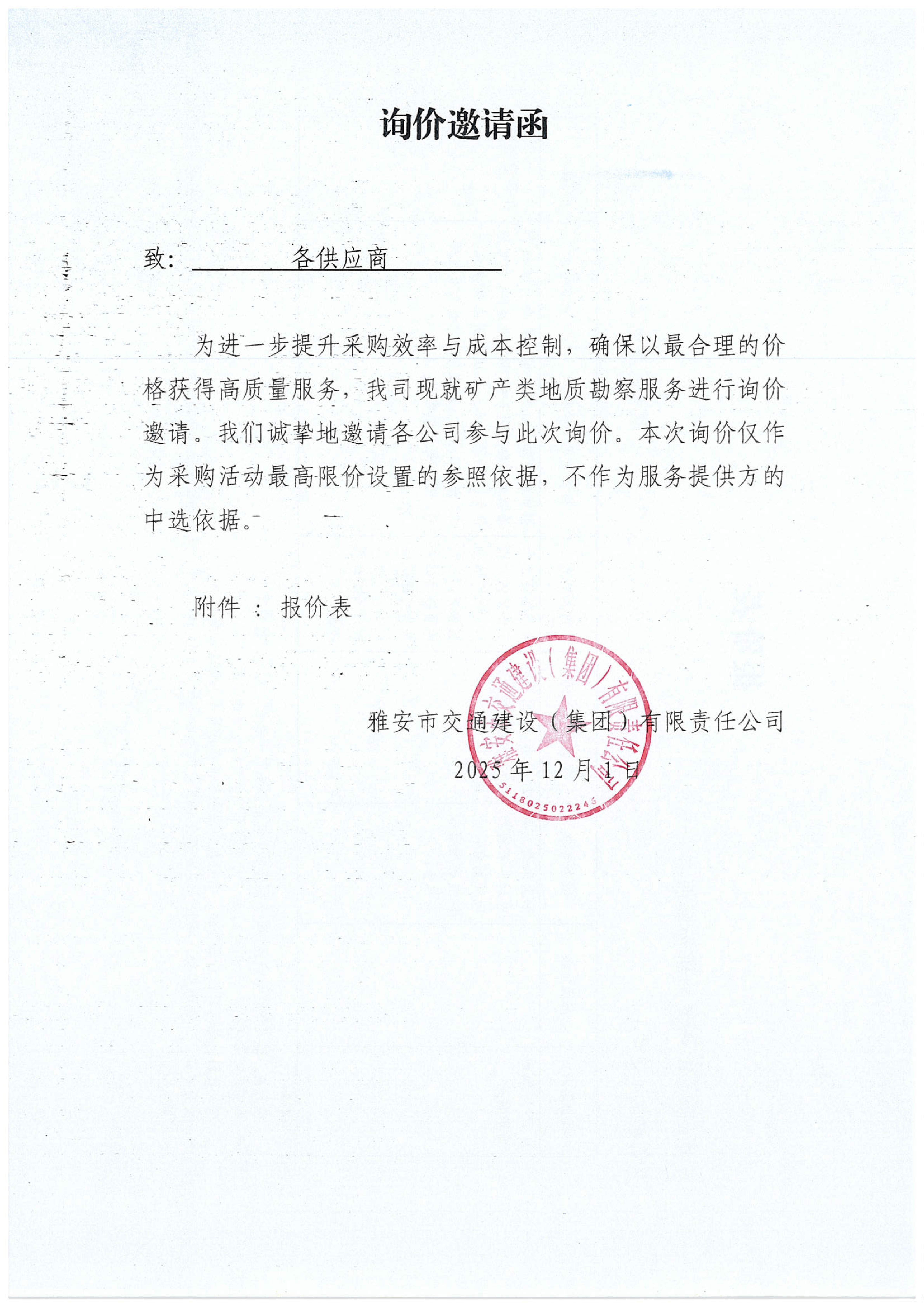 關于雅安市交通建設(集團)有限責任公司礦產(chǎn)類地質(zhì)勘察服務限價的詢價函