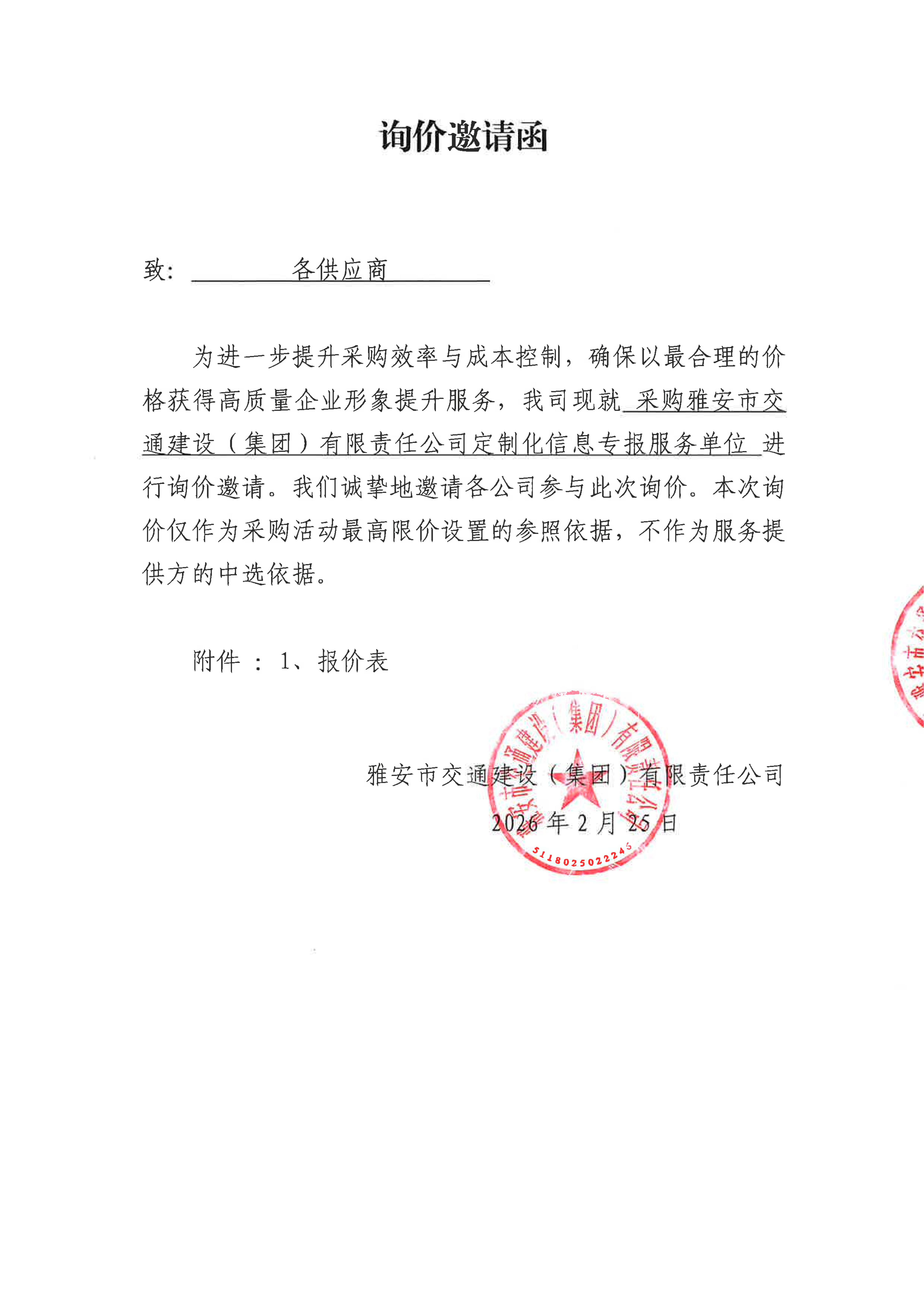 關(guān)于雅安市交通建設(shè)(集團(tuán))有限責(zé)任公司定制化信息專報服務(wù)采購限價的詢價函