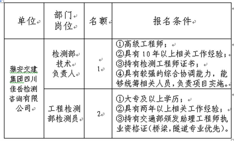 根據發(fā)展需要,決定面向社會公開招聘雅安市交通建設(集團)有限責任公司(以下簡稱“雅安交建集團”)所屬子公司工作人員3名,現將有關事項公告如下: