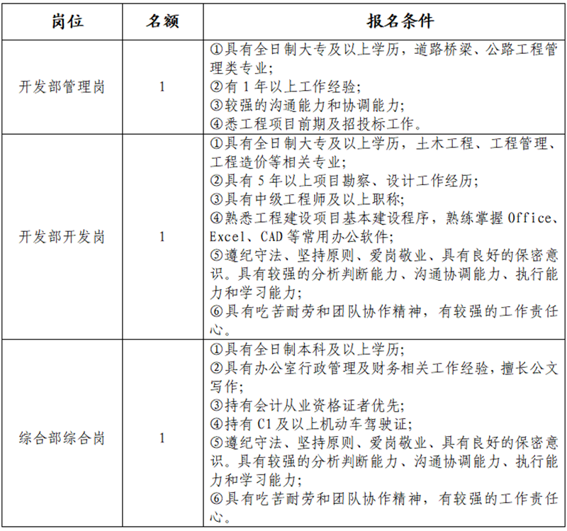 雅安交建集團大興交通開發(fā)有限公司是雅安市重點國有企業(yè)雅安市交建集團下屬子公司,主要從事交通基礎(chǔ)設(shè)施及服務(wù)設(shè)施投資、建設(shè)開發(fā);土地整理;房地產(chǎn)開發(fā);建筑材料生產(chǎn)、銷售;旅游開發(fā)等業(yè)務(wù)。根據(jù)公司發(fā)展需要,決定面向社會公開招聘3名工作人員,現(xiàn)將有關(guān)事項公告如下: