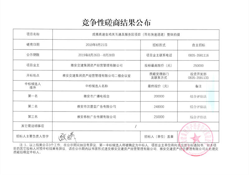 成雅高速金雞關(guān)互通及服務(wù)區(qū)項目(雨名快速通道)整體拍攝競爭性磋商結(jié)果公布