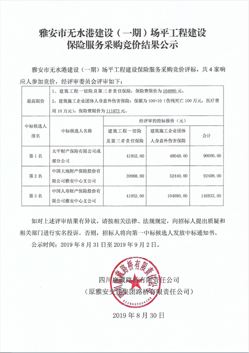 雅安市無水港建設(一期)場平工程建設保險服務采購競價結(jié)果公示