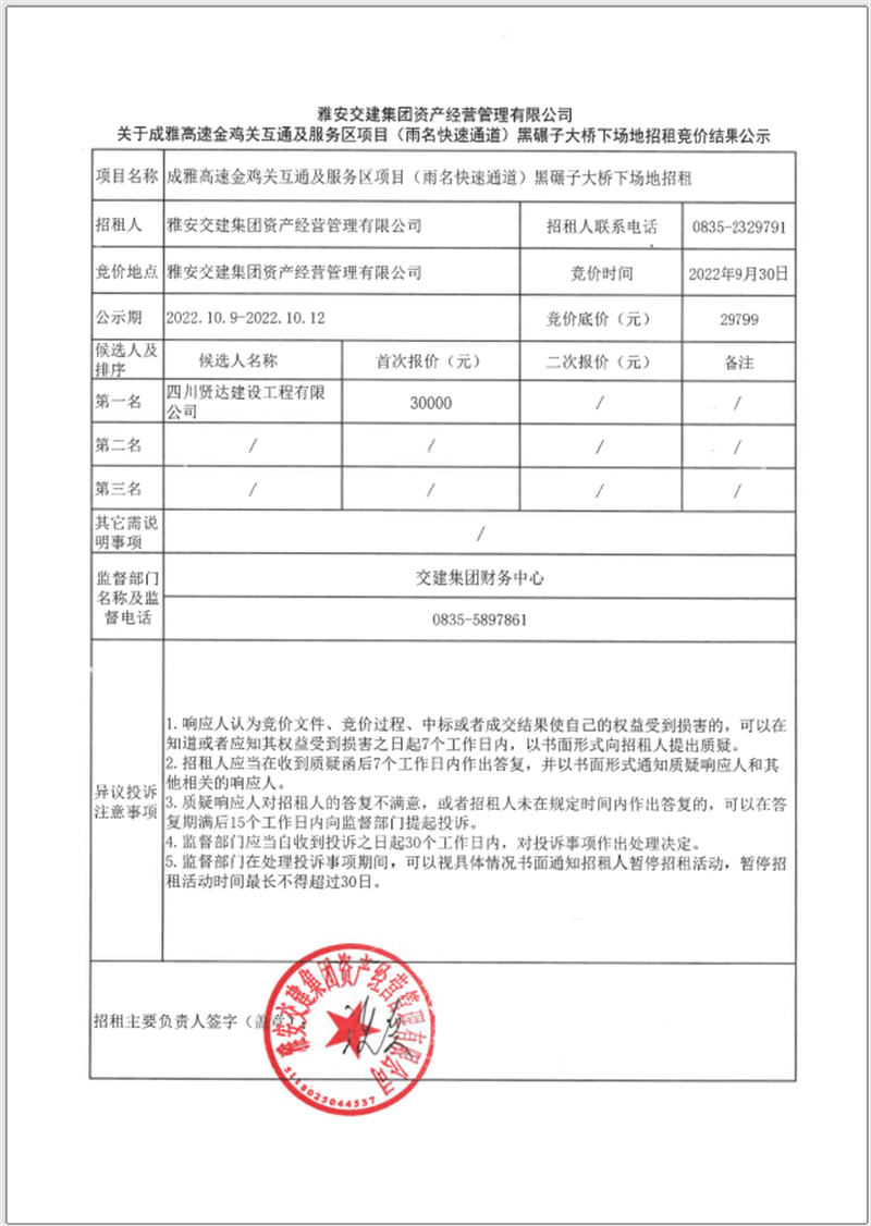關(guān)于成雅高速金雞關(guān)互通及服務(wù)區(qū)項(xiàng)目(雨名快速通道)黑碾子大橋下場地招租競價(jià)結(jié)果公示