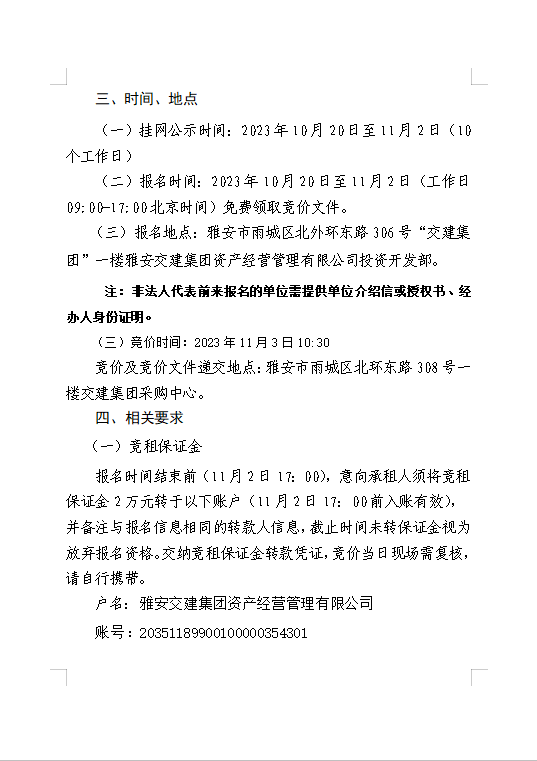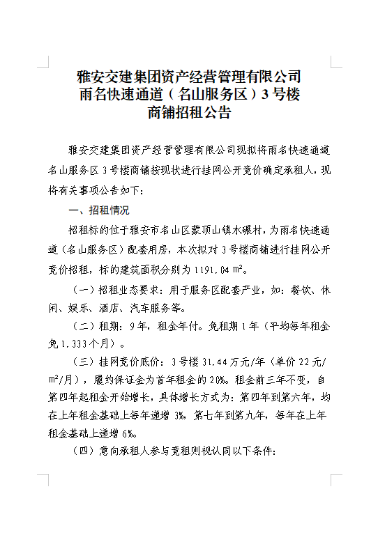 雅安交建集團資產經(jīng)營管理有限公司 雨名快速通道(名山服務區(qū))3號樓商鋪招租公告