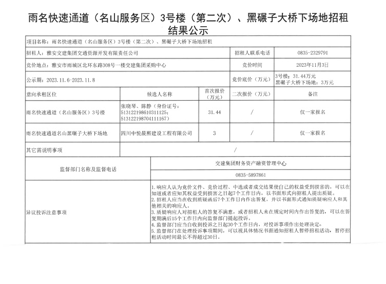 雅安交建集團交通資源開發(fā)有限責任公司雨名快速通道(名山服務區(qū))3號樓(第二次)黑碾子大橋下場地招租結果公示