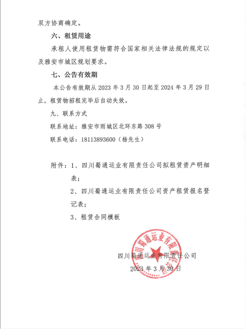 蜀通運(yùn)業(yè)有限責(zé)任公司關(guān)于閑置資產(chǎn)公開招租的公告附件
