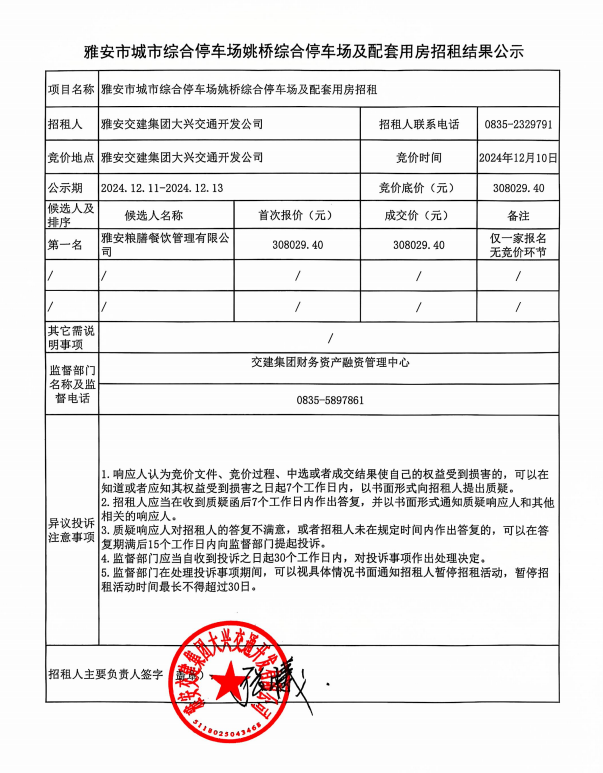 雅安市城市綜合停車場姚橋綜合停車場及配套用房招租結果公示