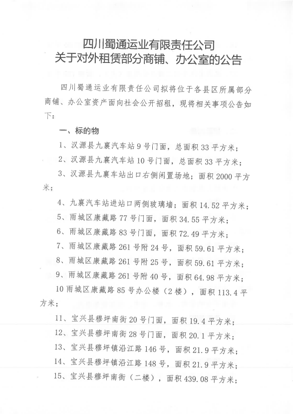 ËÄ´¨Êñͨß\˜I(y¨¨)ÓÐÏÞØŸ(z¨¦)Èι«Ë¾êP(gu¨¡n)ÓÚŒ¦Íâ×âÙU²¿·ÖéTÃæ¡¢Þk¹«ÊÒÙY®a(ch¨£n)µÄ¹«¸æ¸½¼þ