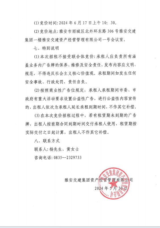 雅安交建集團資產(chǎn)經(jīng)營管理有限公司關于戶外廣告位競價招租的公告
