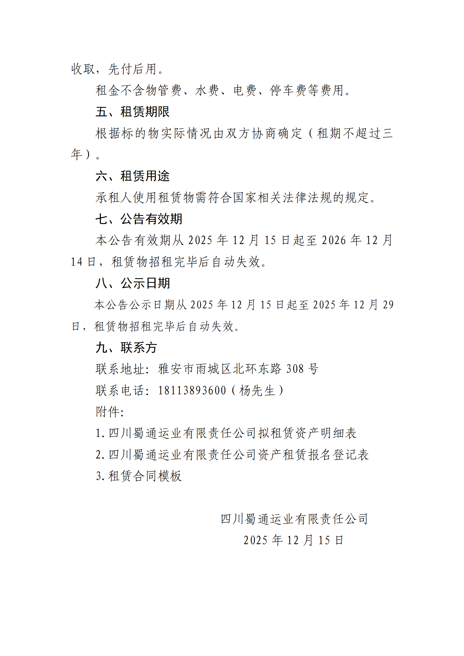 四川蜀通運(yùn)業(yè)有限責(zé)任公司關(guān)于蜀通公司各區(qū)縣閑置房屋商鋪場地掛網(wǎng)招租的公告