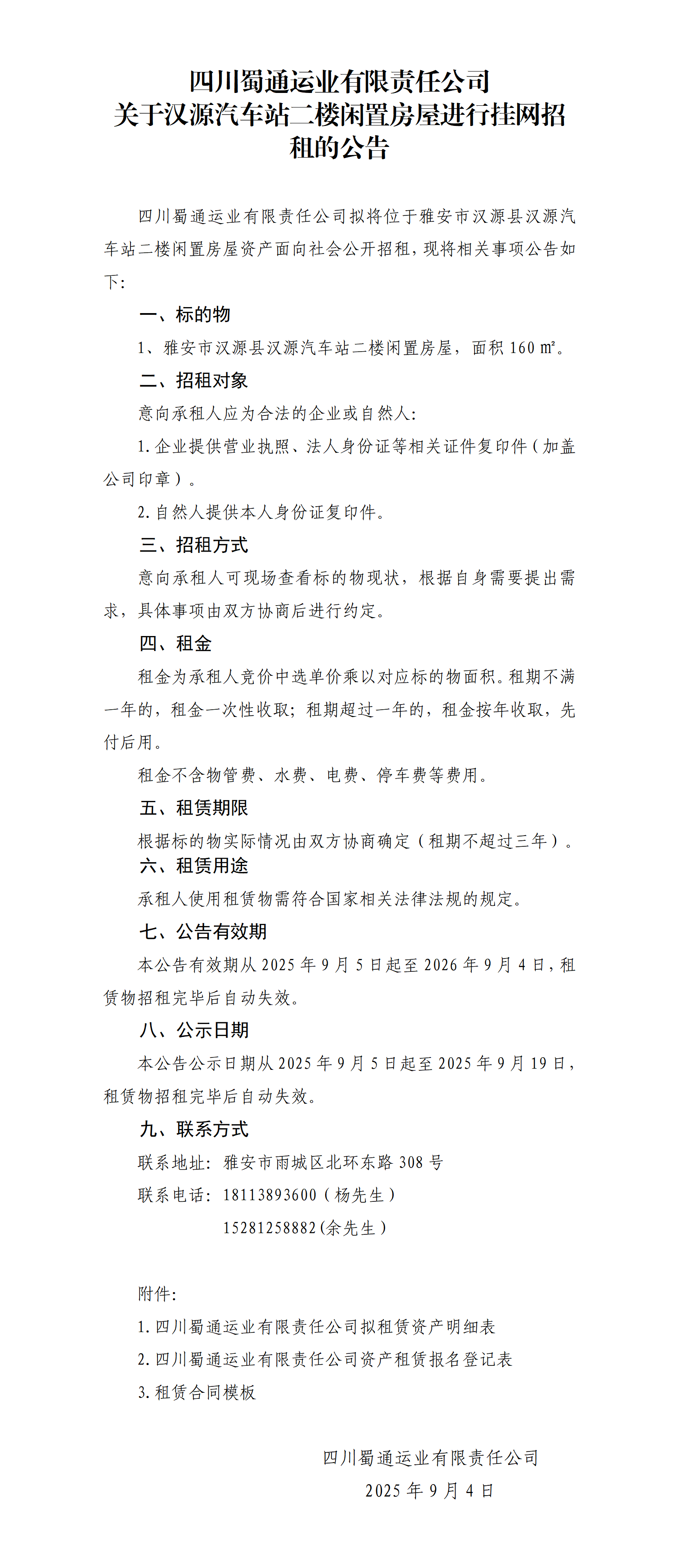 四川蜀通運(yùn)業(yè)有限責(zé)任公司 關(guān)于漢源汽車(chē)站二樓閑置房屋進(jìn)行掛網(wǎng)招租的公告