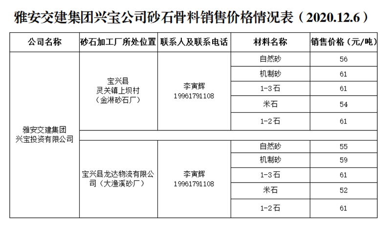雅安交建集團(tuán)興寶公司砂石骨料銷售價(jià)格情況表(2020.12.6)