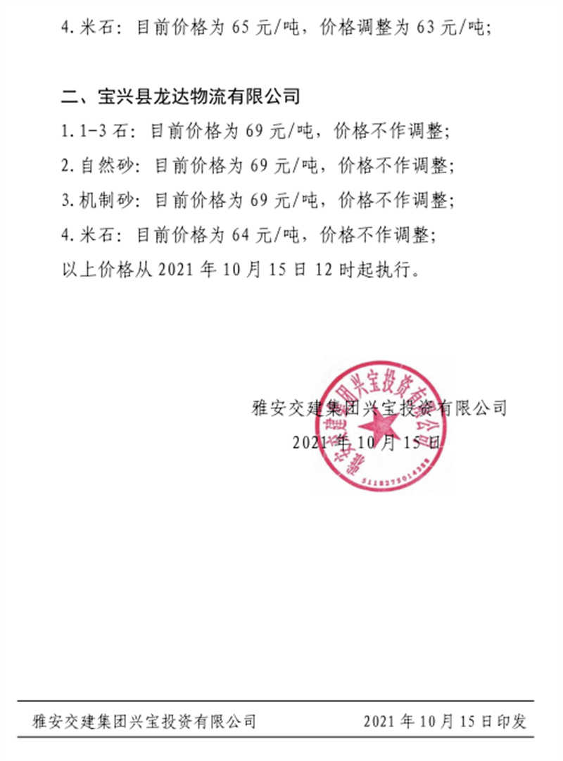 雅安交建集團(tuán)興寶公司關(guān)于調(diào)整成品料銷售價格的通知(2021.10.15)