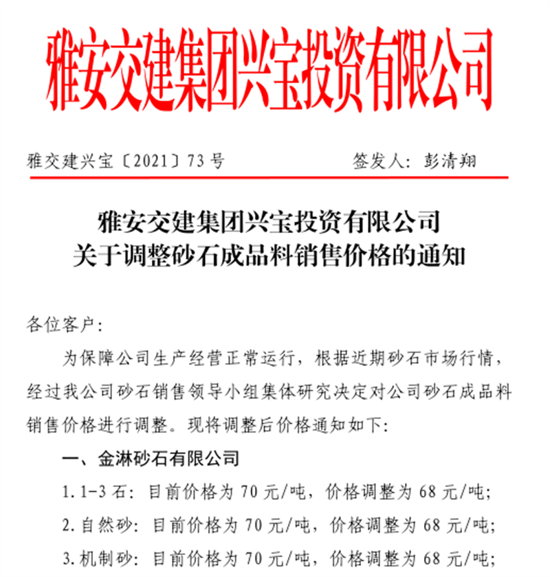 雅安交建集團(tuán)云石公司關(guān)于調(diào)整成品料銷售價格的通知(2021.11.4)