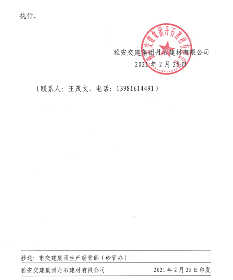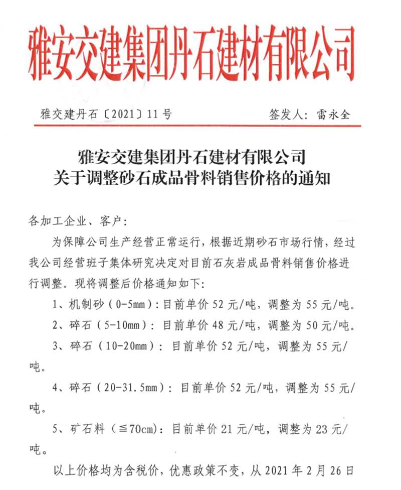 雅安交建集團丹石公司石灰?guī)r成品骨料掛牌價(2021.2.25)