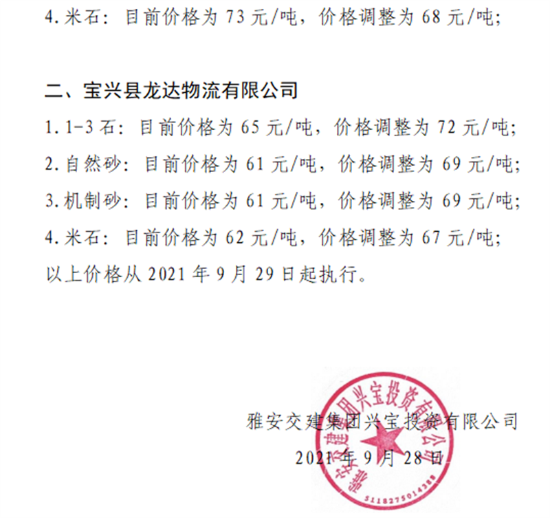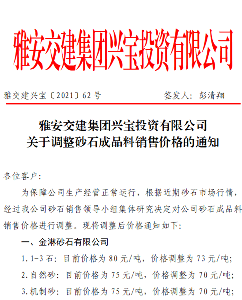 雅安交建集團(tuán)興寶公司關(guān)于調(diào)整砂石成品料銷售價格的通知(2021.9.28)