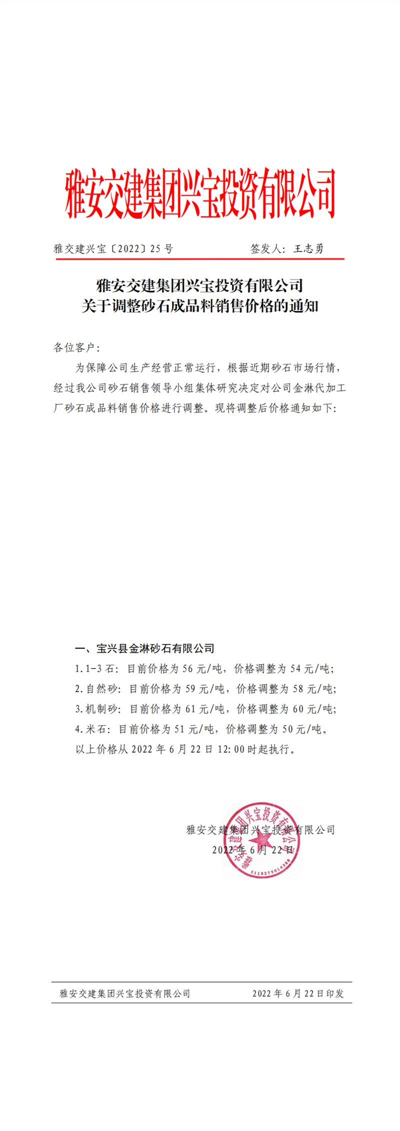 雅安交建集團(tuán)興寶投資有限公司 關(guān)于調(diào)整砂石成品料銷(xiāo)售價(jià)格的通知(2022-6-22)