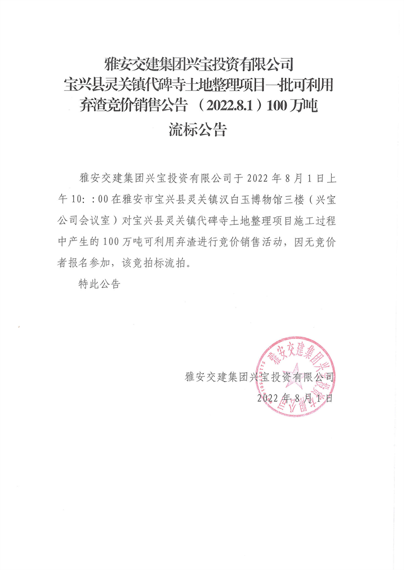 雅安交建集團(tuán)興寶投資有限公司靈關(guān)鎮(zhèn)代碑寺土地整理項(xiàng)目100萬(wàn)噸可利用棄渣競(jìng)價(jià)銷售流標(biāo)公告(2022.8.1)