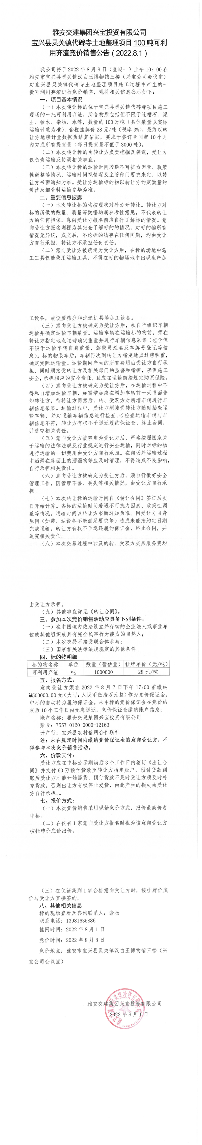 雅安交建集團興寶投資有限公司靈關鎮(zhèn)代碑寺土地整理項目100萬噸可利用棄渣競價銷售公告(2022.8.1)
