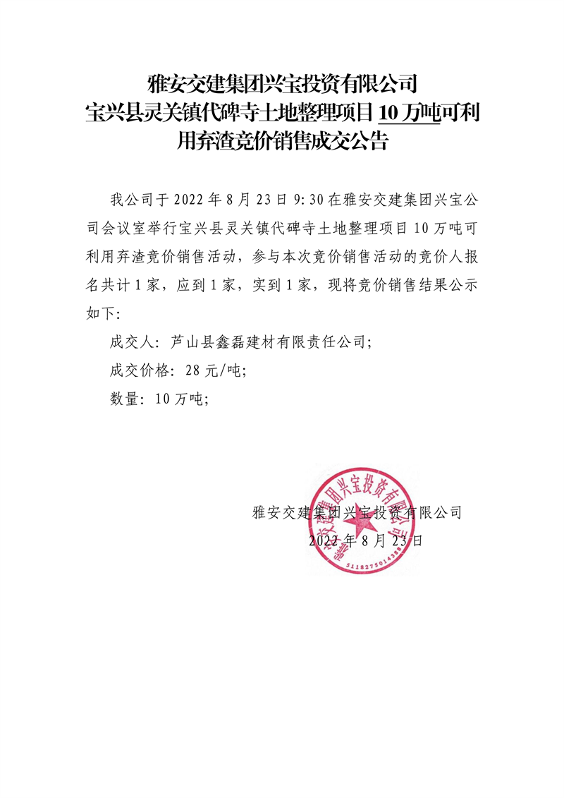 雅安交建集團興寶投資有限公司寶興縣靈關(guān)鎮(zhèn)代碑寺土地整理項目5萬噸可利用棄渣競價銷售成交公告(8.23)