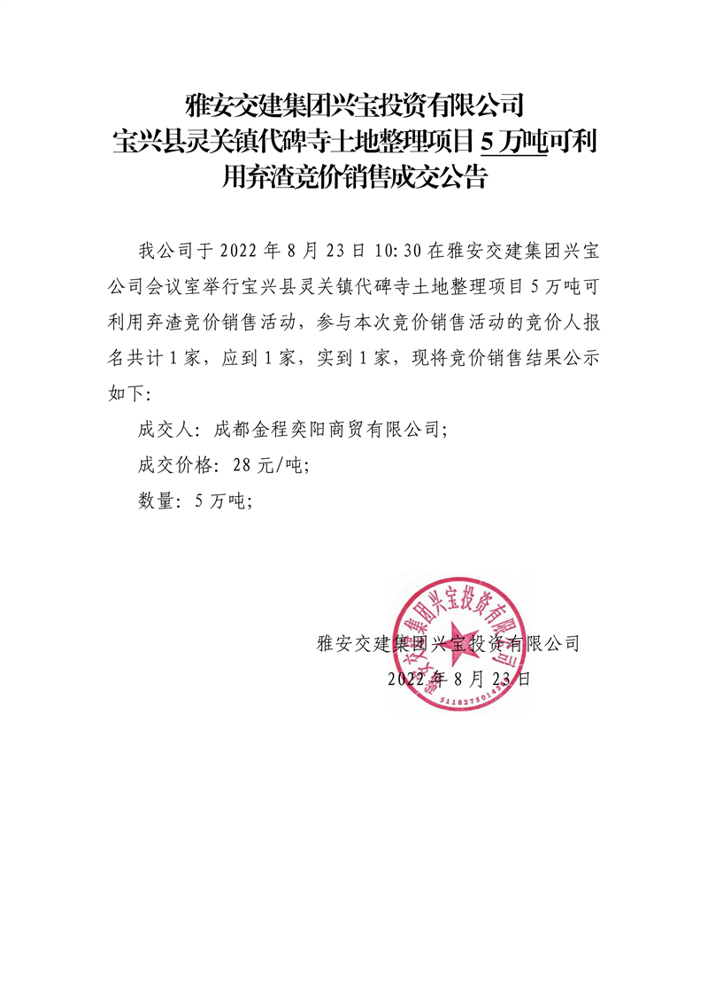 雅安交建集團(tuán)興寶投資有限公司寶興縣靈關(guān)鎮(zhèn)代碑寺土地整理項(xiàng)目10萬噸可利用棄渣競(jìng)價(jià)銷售成交公告(8.23)