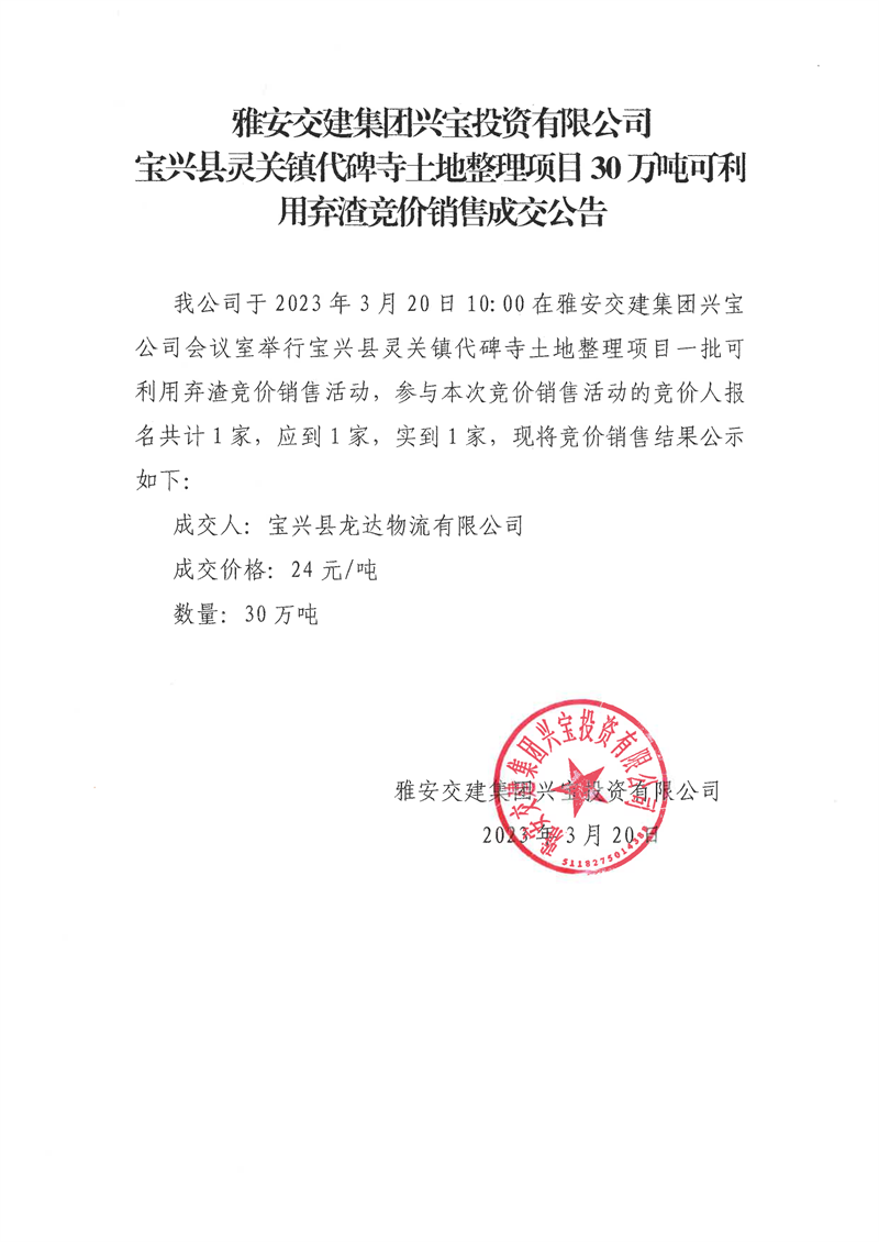 雅安交建集團(tuán)興寶投資有限公司靈關(guān)鎮(zhèn)代碑寺土地整理項(xiàng)目30萬(wàn)噸可利用棄渣競(jìng)價(jià)銷售成交公告(2023.3.20)