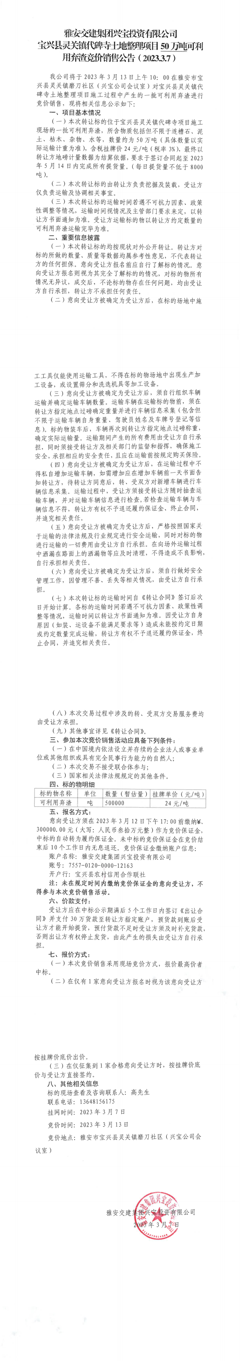 雅安交建集團(tuán)興寶投資有限公司靈關(guān)鎮(zhèn)代碑寺土地整理項(xiàng)目50萬噸可利用棄渣競(jìng)價(jià)銷售公告(2023.3.7)