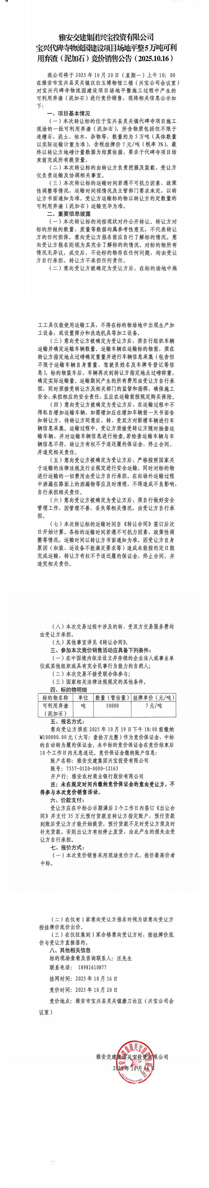 雅安交建集團(tuán)興寶投資有限公司寶興代碑寺物流園建設(shè)項(xiàng)目場地平整5萬噸可利用棄渣(泥加石)競價銷售公告(2025.10.16)
