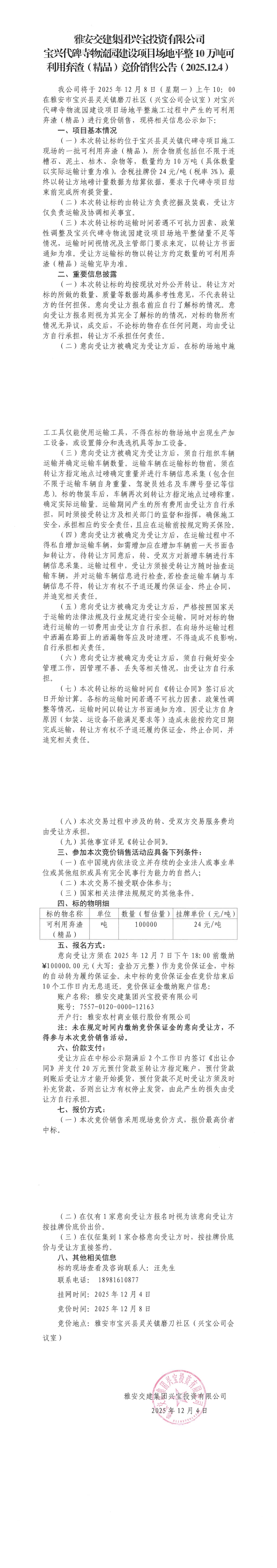 雅安交建集團(tuán)興寶投資有限公司10萬(wàn)噸可利用棄渣(精品)競(jìng)價(jià)銷(xiāo)售掛網(wǎng)公告(2025.12.04)